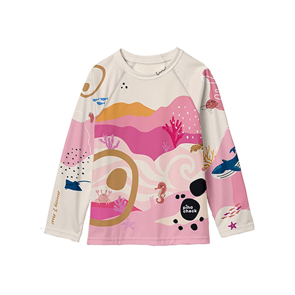 Růžové ochranné UPF 50+ triko je součástí první autorské rodinné kolekce Piháčka. Přichází ve veselých barvách s dominující světlou a sladce růžovou, spolu s několika podmořskými kamarády včetně hravé krevetky, chobotnice, velryby nebo rejnoka.
